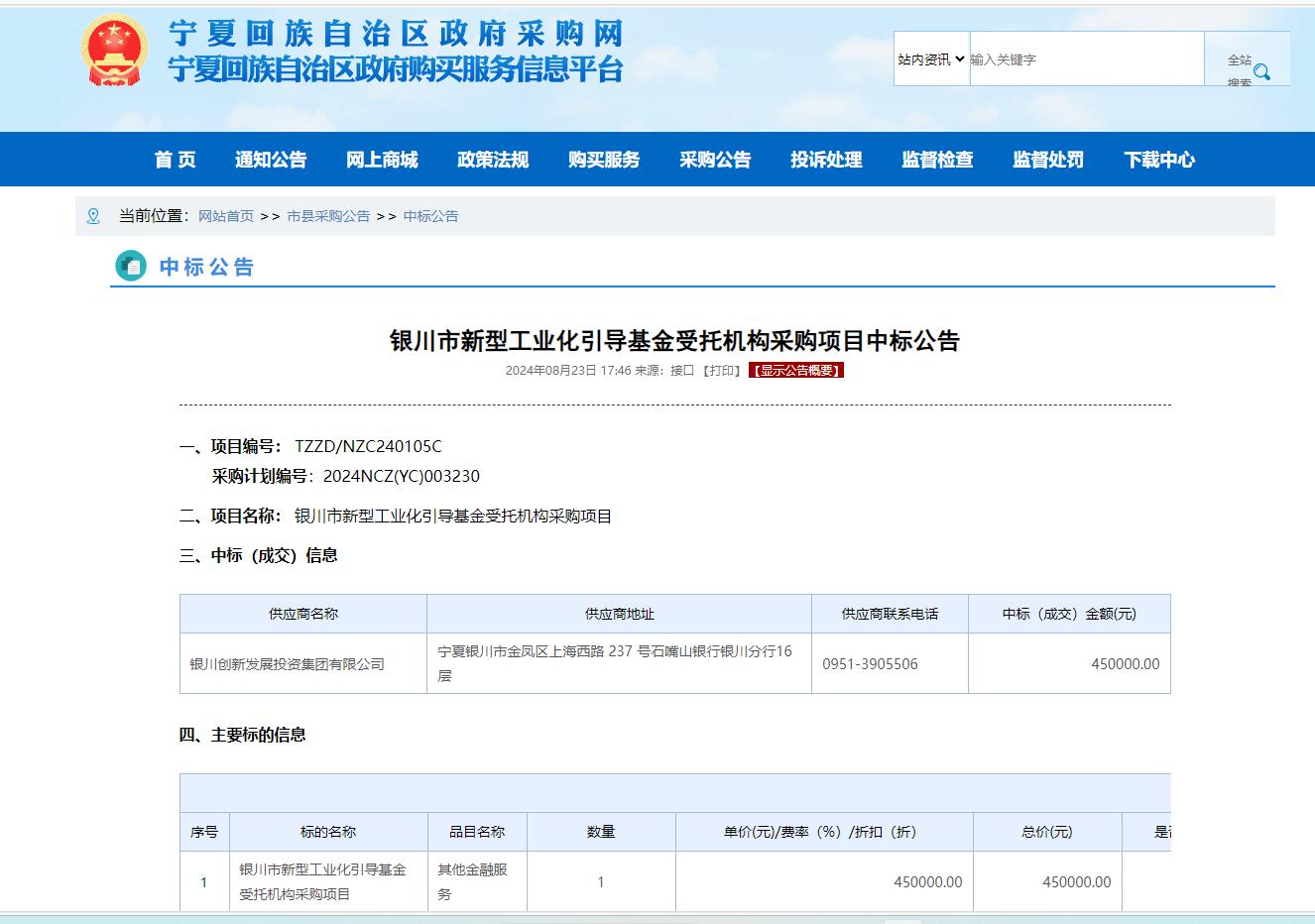 8月23日,銀川創(chuàng)投集團(tuán)中標(biāo)銀川市新型工業(yè)化引導(dǎo)基金受托機(jī)構(gòu)采購(gòu)項(xiàng)目。